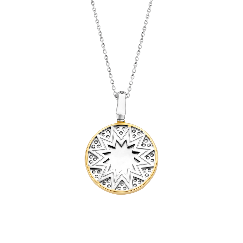 Este pendente de prata banhado a ouro da TI SENTO - Milano tem um sol banhado a ouro no centro. Esta lembrança em forma de sol é um remember para a sua fonte de energia, todos os dias. A medalha, feita de prata de lei 925, vem com um colar de corrente de prata fina.