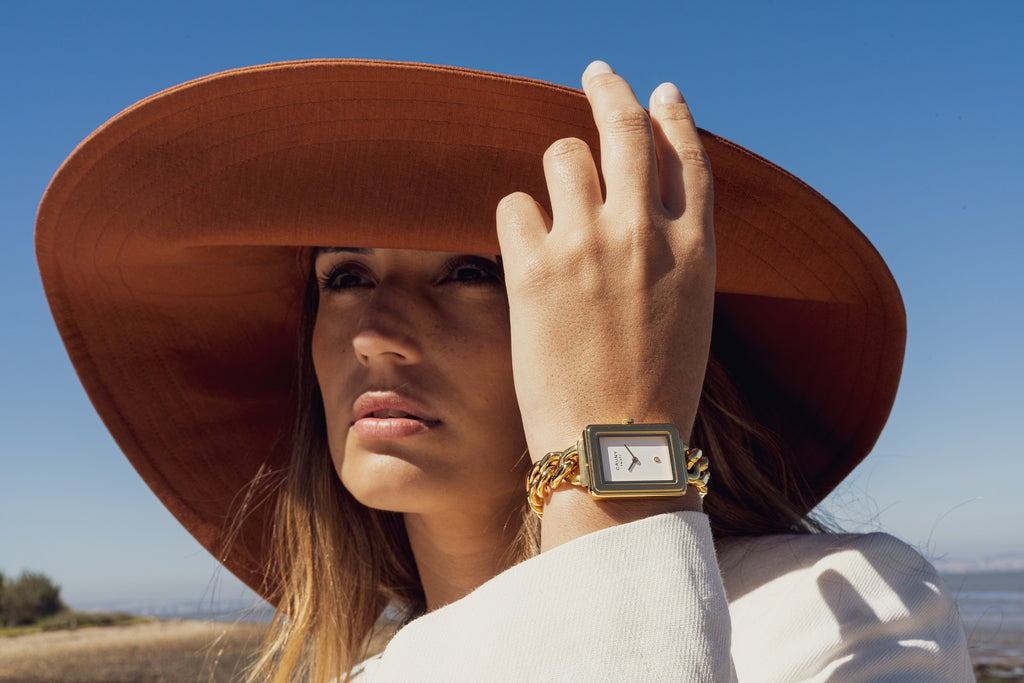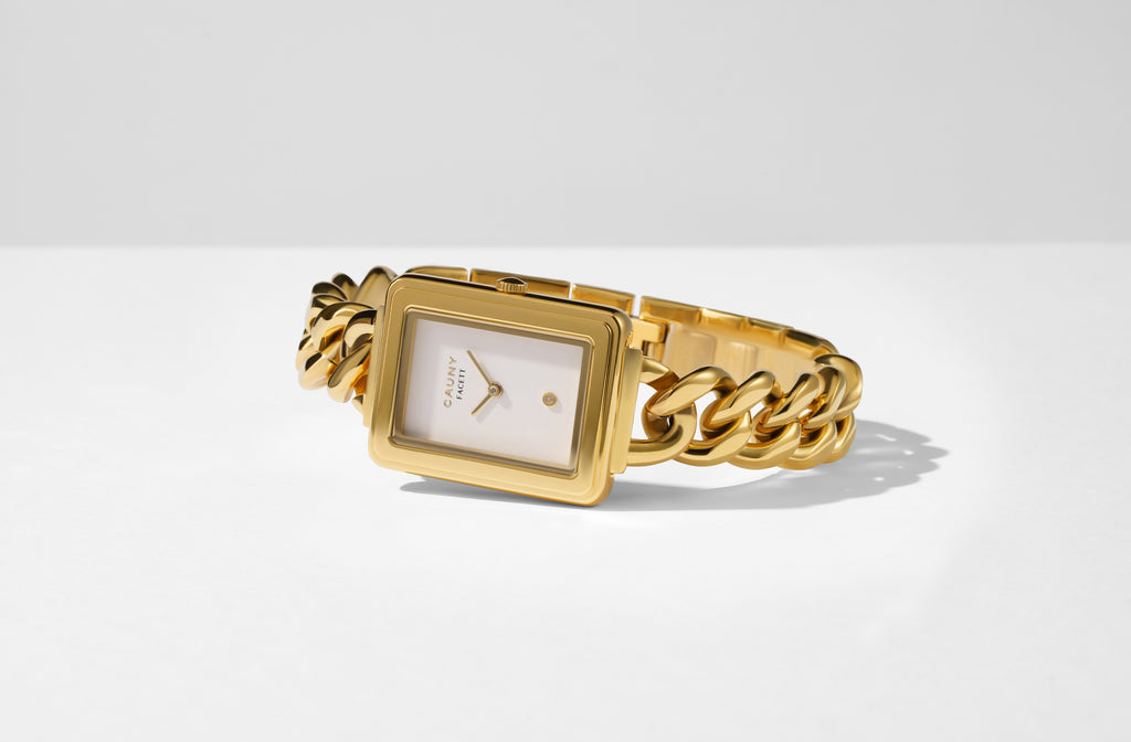 Com Diamante Natural O Facett Diamond Gold distingue-se pelo seu mostrador retangular, uma estreia no design icónico característico da Cauny. Com caixa em aço de alta precisão 316L, uma requintada corrente de elos dourada e o mostrador branco com um diamante natural ao centro, este modelo é a prova de que um relógio também é uma jóia.
